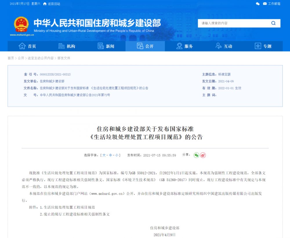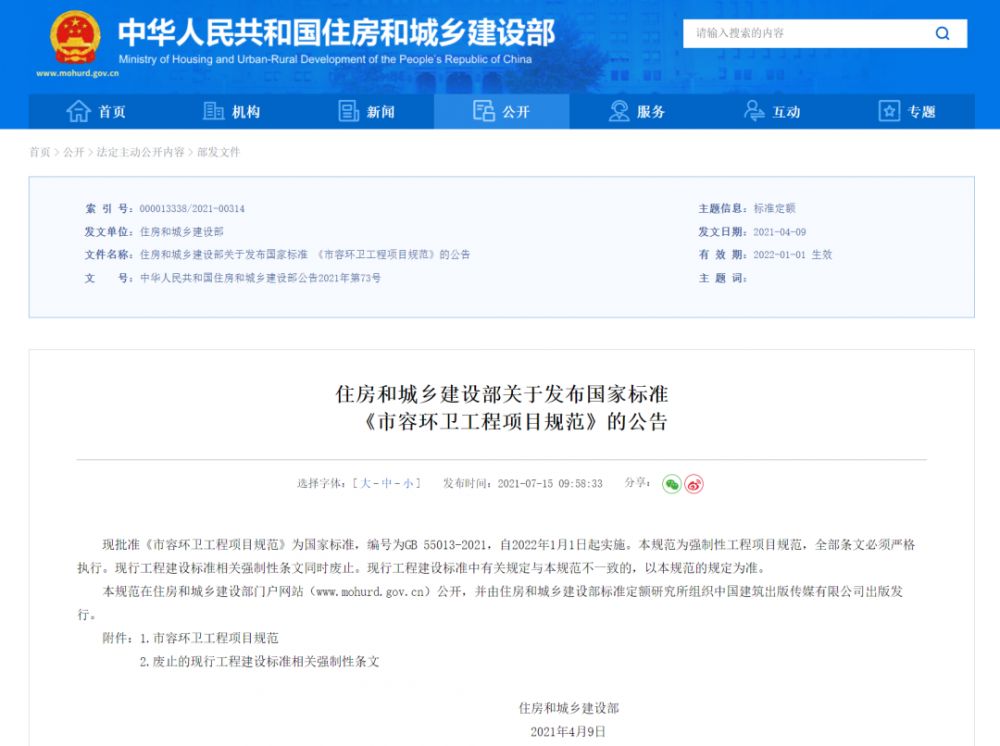 7月15日,住房和城鄉建設部最新發布了《市容環衛工程項目規范》、《生活垃圾處理處置工程項目規范》、《園林綠化工程項目規范》三項國家標準,這三項國家標準將于2022年1月1日起生效。規范文件中明確:強制性工程建設規范實施后,現行工程建設地方標準中的強制性條文同時廢止。