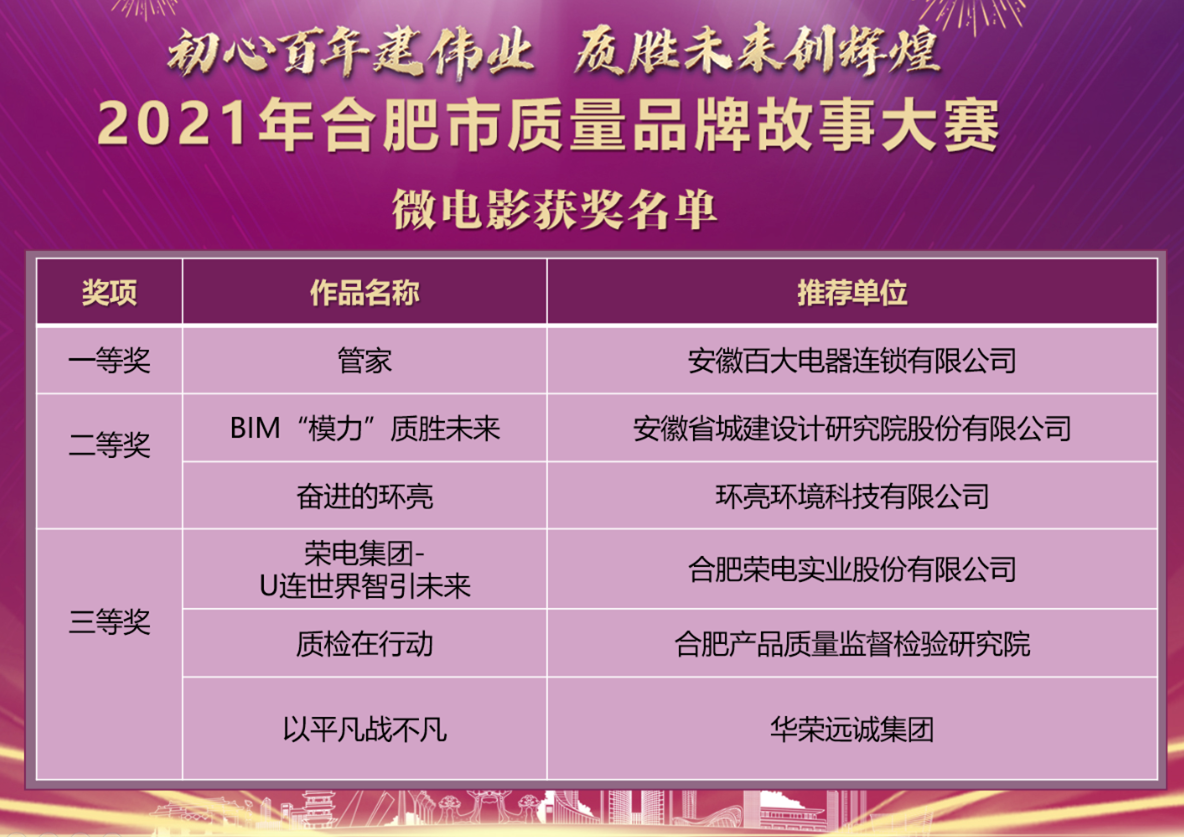 合肥市質量品牌故事大賽始于2019年,截止目前已經成功舉辦了三屆。本屆大賽緊扣“初心百年建偉業  質勝未來創輝煌”大賽主題,鼓勵各行業企業深入挖掘品牌內涵,以多視角、多形式講好品牌故事,積極塑造和傳播合肥品牌形象。我公司選送的微電影作品《奮進的環亮》獲得2021年合肥市質量品牌故事大賽二等獎。