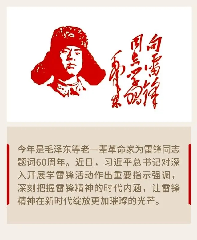 今年是毛澤東等老一輩革命家為雷鋒同志題詞60周年。黨的十八大以來,習近平總書記就學習弘揚雷鋒精神多次作出重要指示,他強調,無論時代如何變遷,雷鋒精神永不過時。