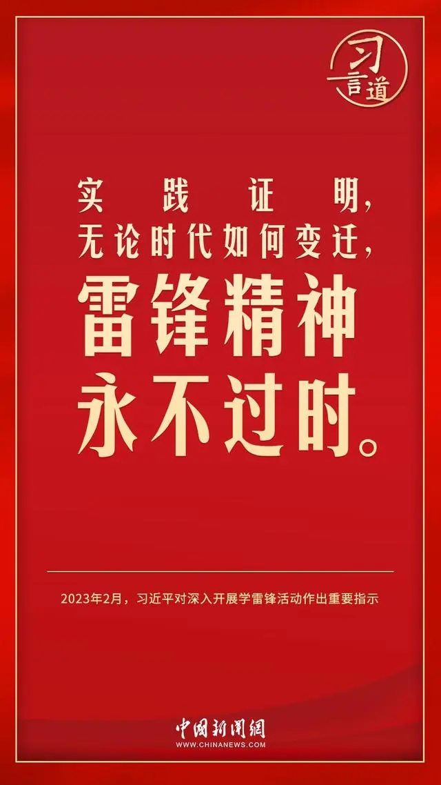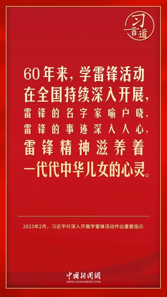 中共中央總書記、國家主席、中央軍委主席習近平近日作出重要指示指出,今年是毛澤東等老一輩革命家為雷鋒同志題詞60周年。60年來,學雷鋒活動在全國持續深入開展,雷鋒的名字家喻戶曉,雷鋒的事跡深入人心,雷鋒精神滋養著一代代中華兒女的心靈。實踐證明,無論時代如何變遷,雷鋒精神永不過時。