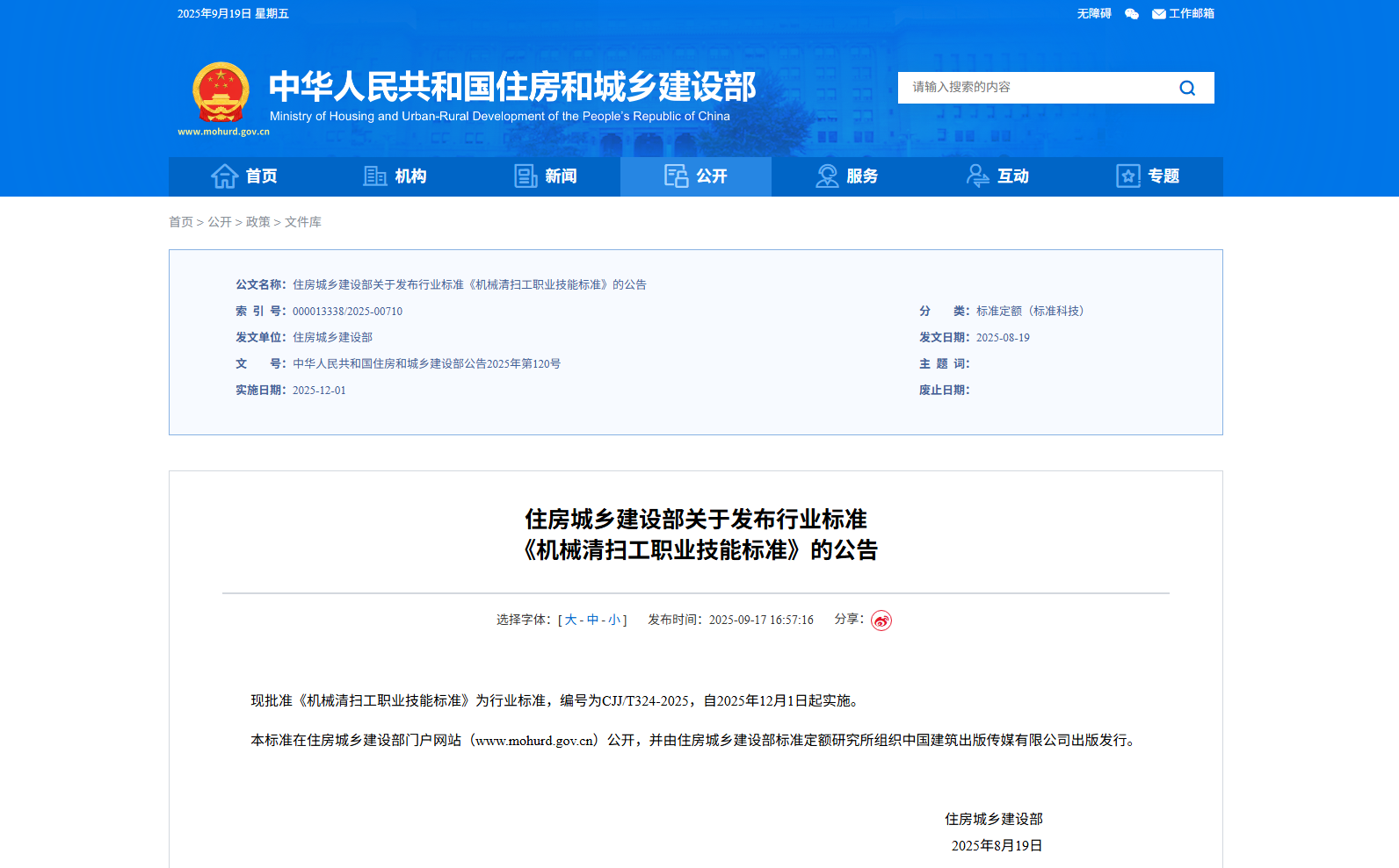 近日,住房城鄉(xiāng)建設(shè)部發(fā)布公告,批準(zhǔn)《機(jī)械清掃工職業(yè)技能標(biāo)準(zhǔn)》為行業(yè)標(biāo)準(zhǔn),編號(hào)為CJJ/T324-2025,自2025年12月1日起實(shí)施。該標(biāo)準(zhǔn)由住房城鄉(xiāng)建設(shè)部標(biāo)準(zhǔn)定額研究所組織中國建筑出版?zhèn)髅接邢薰境霭姘l(fā)行。